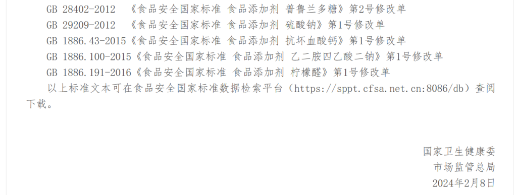 2024年3月12日,国家卫生健康委员会、国家市场监督管理总局发布《食品安全国家标准 食品添加剂使用标准》(GB 2760-2024)等47项食品安全国家标准和6项修改单,对多个领域的标准进行了修订更新。